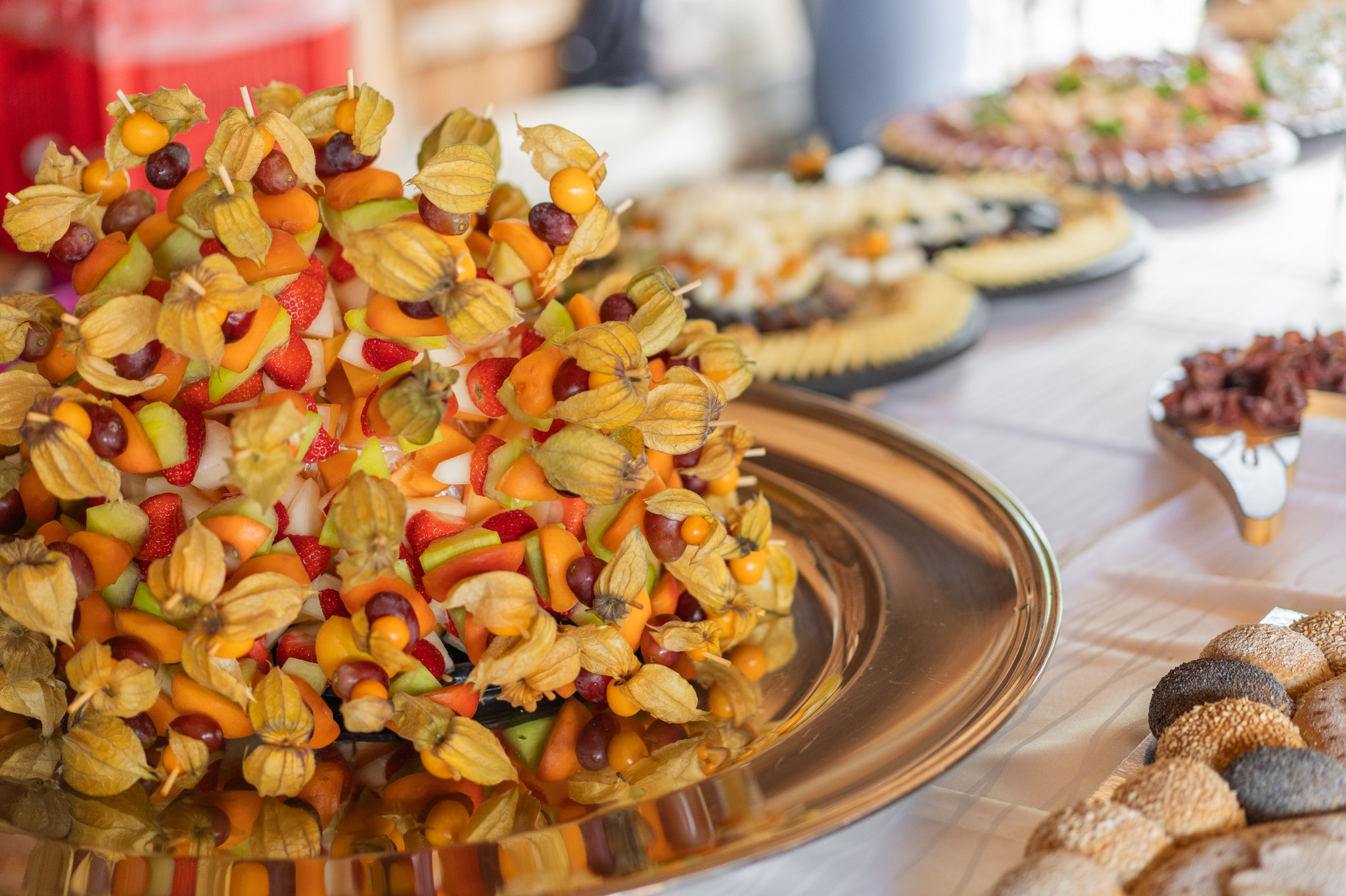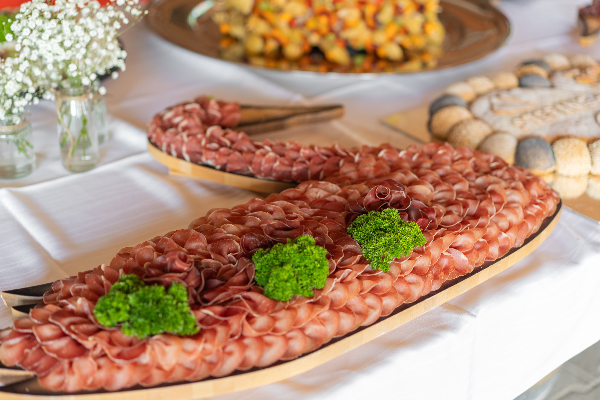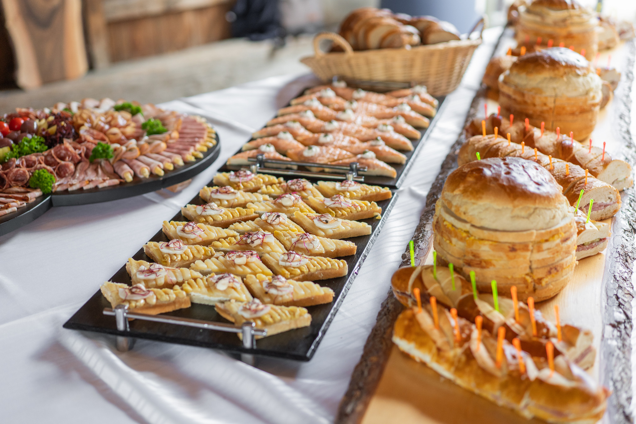 Aus Platten mit kalten muotathaler Fleisch- und Käsespezialitäten, Fruchtkugeln und -schalen, Meter- und Überraschungsbroten, Gemüsedips, Canapés, Antipasti und mehr entsteht ein Buffet, das nicht nur Genuss verspricht, sondern auch ein echter Hingucker ist.